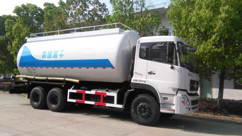 东风天龙后双桥卧式干混砂浆运输车,卧式砂浆车多为25方罐,罐体总成主要有罐体、加料口,流化床,出料管总成,清料口、进气管及其他附件组成。